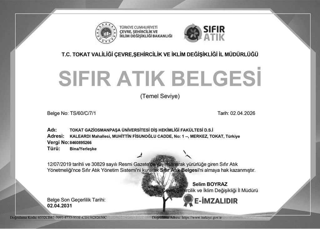 Tokat Gaziosmanpaşa Üniversitesi Diş Hekimliği Fakültemiz ve Ağız ve Diş Sağlığı Hastanemize, Tokat Valiliği Çevre, Şehircilik ve İklim Değişikliği İl Müdürlüğü tarafından yürütülen çalışmalar kapsamında “Sıfır Atık Yönetim Sistemi”ni başarıyla kurarak Sıfır Atık Belgesi almaya hak kazandı.